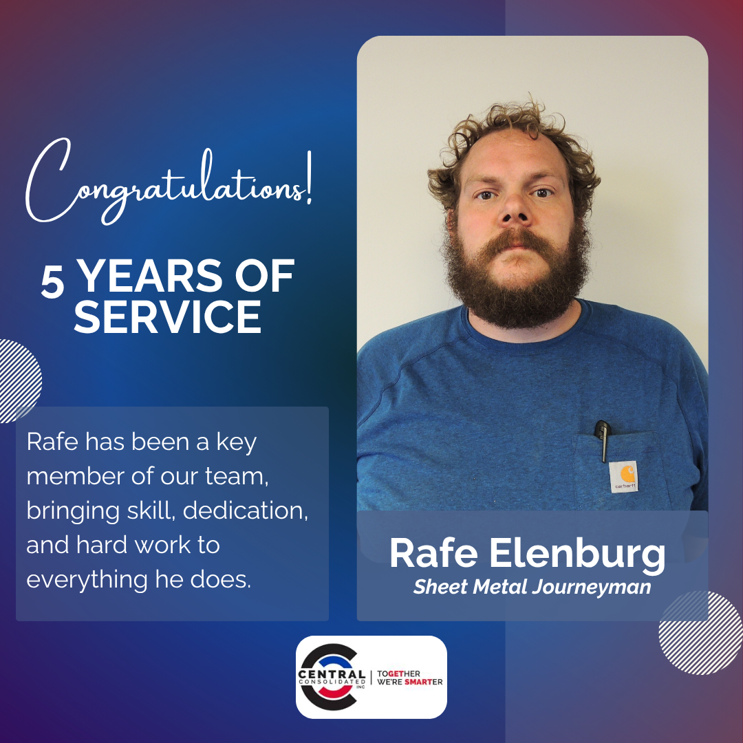 We’re proud to recognize Rafe for reaching an incredible milestone: 5 years of service with Central Consolidated!